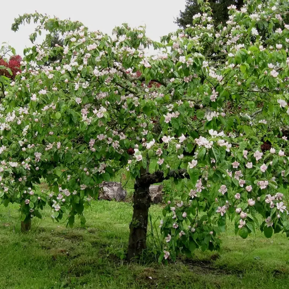 Quince trees are a beautiful sight in any garden. Their large, soft green leaves and pale pink blossoms in spring create a romantic, old-world charm. The golden fruits in fall are not only delicious but also wonderfully fragrant, perfuming your entire garden.