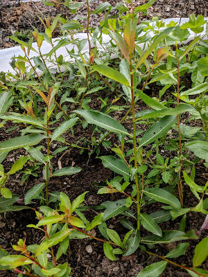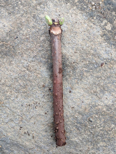 Willows: Willows are so dang easy. A good one to start with if you’re a newbie. Just stick dormant stick into the ground the right way up and you’ve done it. One of the twigs from my willow pruning got dropped and partially covered with woodchip mulch and I discovered it during the summer with vigorous roots and shoots. Hardwood cuttings and softwood cuttings both root quickly and produce vigorous young plants. Thicker cuttings seem to work especially well with willows. You can also plant larger cuttings directly into the field, rather than a nursery bed. This is called “live staking.” I aim for a thick 2-3 foot long cutting pushed more than halfway into the ground.
