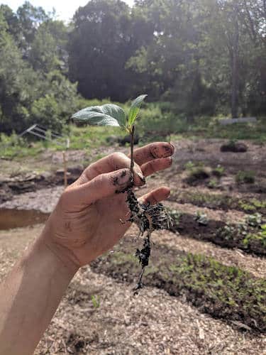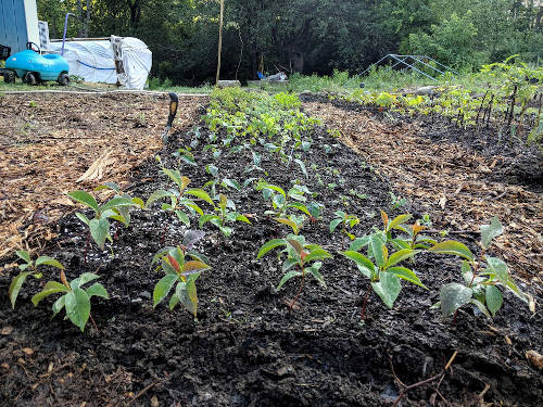 Nursery bed: The nursery bed is an area of your garden dedicated specifically to raising young plants. Baby plants grown from seeds and cuttings need extra coddling if you want to have a high success rate with them. The conditions in your nursery bed should be as good as you can possibly make them—deep, well-drained, loose soil full of organic matter, well mulched and free of weeds, good sunlight, protected from wind—you’ve heard this before, right? Creating optimum conditions for plant growth is the name of the game. You may be thinking “nature doesn’t need a nursery bed to make millions of trees, so why should I use one? Why can’t I just scatter seed around and stick cuttings where I want plants to grow?” I’ve tried it, and you should too. You’ll soon understand that it’s just not practical. Trying to keep track of tiny plants growing all over your land is really difficult. Not to mention keeping all those areas free of weeds, watered, etc. Remember that a tree will disperse hundreds of thousands or even millions of seeds to produce a single mature offspring. We don’t have that luxury as humans. So embrace the nursery bed, where you can care for many plants in a small space. After one or two years of growing, dormant plants should be moved to their final destination. After two years plants growing closely together become much more difficult to efficiently transplant.
