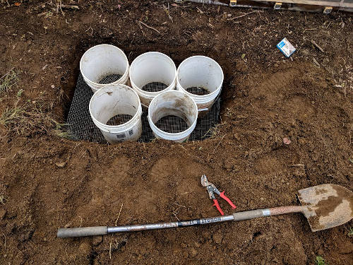 Air pruning bed: The air pruning bed is for growing taprooted species. Many nut trees send out crazy long taproots that make them difficult to transplant. So instead they can be planted in a container raised so that there is air between the bottom of the container and the ground. The container’s bottom is made with hardware cloth, which exposes the bottom of the soil in the container to the air. When the roots hit the bottom of the container they hit the air, stop growing and branch out to become more fibrous. The air prune bed is a low-cost way to propagate trees. It’s really easy to get the trees out with their entire root system at the end of the season. You can make them quite large permanent structures or small boxes that you can pick up.